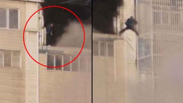 Başakşehir'de çıkan yangında iş yerinin en üst katında mahsur kalan işçi, yangın merdivenlerinin dış demirlerine tutunarak aşağı inmeyi başardı. Can pazarının yaşandığı o anlar cep telefonu kamerasıyla kaydedildi.