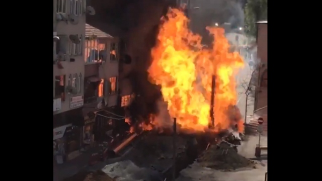 Beylikdüzü Gürpınar'da İSKİ çalışmaları sırasında doğal gaz borusu patladı. Metrelerce yukarıya alevler çıkarken olay yerine çok sayıda itfaiye ekibi sevk edildi.