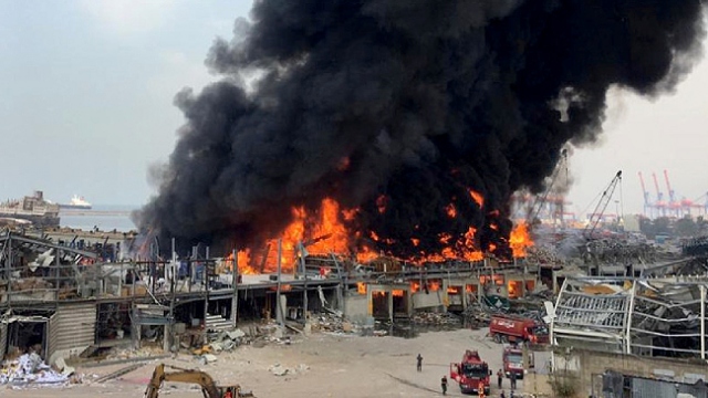 Lübnan'ın başkenti Beyrut'taki limanda bulunan bir hangarda henüz bilinmeyen nedenle büyük bir yangın çıktı.