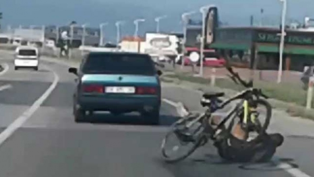 Bursa'da otomobile tutunarak onunla aynı hızda seyahat etmeye çalışan bisiklet sürücüsü, kısa süre sonra dengesini kaybetti. Sürücü, otomobilin altında kalmaktan son anda kurtuldu.