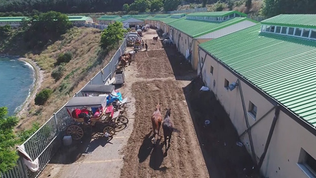 Büyükada'da atların kaldığı 140 ahırdan oluşan "Fayton Park" havadan görüntülendi. Görüntülerde atların temiz bir ortamda bakımının yapıldığı ve özgürce dolaştığı görülüyor.