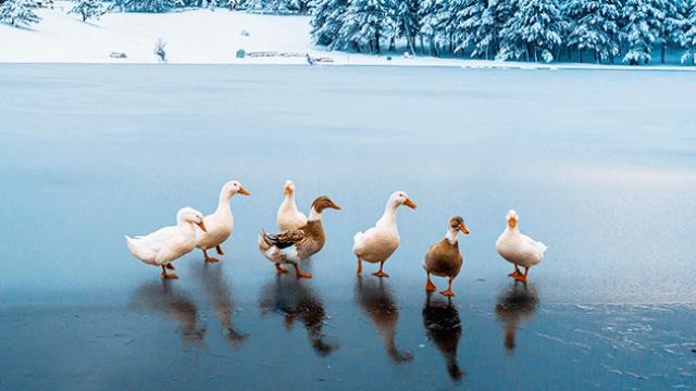 Afyonkarahisar'daki Akdağ Tabiat Parkı'nda yer alan Akdağ Göleti, buz tuttu. Gölet üzerinde arka arkaya yürüyen ördekler, ziyaretçiler tarafından fotoğraflandı.