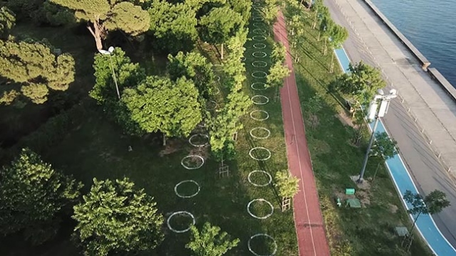 Koronavirüs tedbirleri kapsamında Kadıköy Caddebostan sahilindeki yeşillik alana vatandaşların sosyal mesafeyi korunması amacıyla çemberler çizildi. Çemberler drone ile havadan görüntülendi.