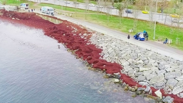 İstanbul'da Caddebostan'dan Maltepe'ye kadar uzanan sahil, kızıla büründü. Kırmızı yosunlar, lodos nedeniyle sahile vurup kayalıkların üzerini kapladı.