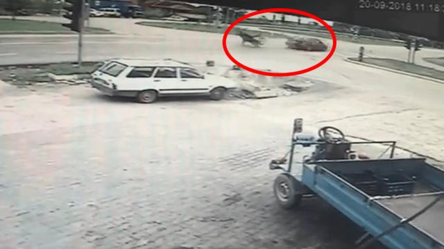 Çanakkale'de hızla geçtiği kavşaktan dönen motosiklete çarpan araç takla attı. İki sürücünün de burnu dahi kanamazken, facianın ucuz atlatıldığı anlar kameralara yansıdı.