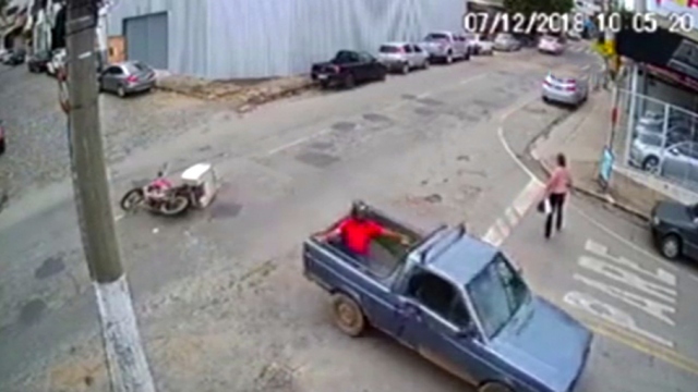 Brezilya'da bir motosiklet sürücüsü, çarptığı kamyonetin kasasına düştü. İlginç olay kameralara yansıdı.