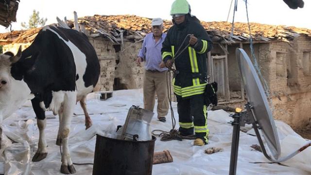 Çatıda mahsur kalan ineği itfaiye ekipleri kurtardı