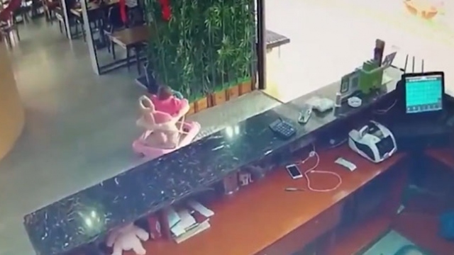 Çin'de bir alışveriş merkezinde yürüyen merdivenden aşağı yuvarlanan yürüteçteki bir bebek, son anda kurtarıldı.