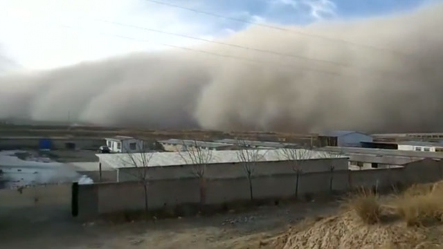 Çin'in kuzeyindeki Kansu eyaletinin Zhangye şehrini vuran kum fırtınası nedeniyle bölgede, yüksekliği yaklaşık 100 metreye ulaşan bir kum duvarı oluştu.
