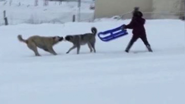 Çocuklar ile köpeklerin kızak kapma mücadelesi