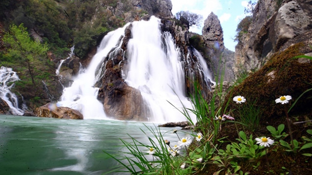 Dağ patikaları ve çam ağaçları eşliğinde Uçansu Şelalesi