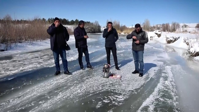 Van Erciş'te inci kefallerinin akıntının tersine yüzdükleri Deli Çayı, hava sıcaklığının eksi 25'e düşmesi nedeniyle dondu. Vatandaşlar, donan çayın üzerinde çay keyfi yaptı.