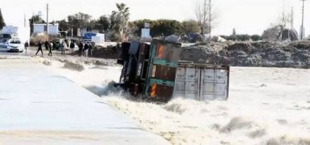Mersin'de kar ve yağmur sularıyla dolan dere yatağındaki yoldan kamyonla geçmek isterken aracın devrilmesi sonucu mahsur kalan sürücü kurtarıldı.