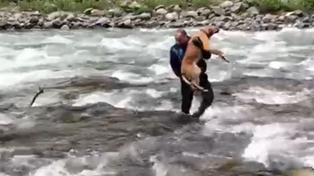 Rize'deki Fırtına Deresi'nde suyun yükselmesi sonucu taşın üstünde mahsur kalan köpek, zabıta görevlisi tarafından kurtarıldı.