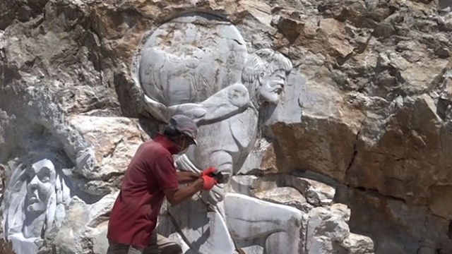 Balıkesir'in yaşayan Nurettin Başkurt, dağ ve yol kenarlarındaki kaya parçalarını oyma tekniği ile heykele dönüştürüyor.