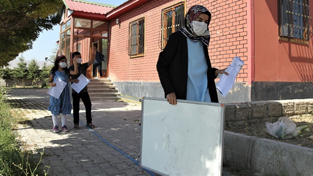 Van'ın Tuşba ilçesinde görevli sınıf öğretmeni Gamze Arslan, uzaktan eğitim sürecinde evde internet imkanı olmayan öğrencilerin daha sağlıklı eğitim alması için yazı tahtasıyla kapı kapı dolaşarak ders veriyor.