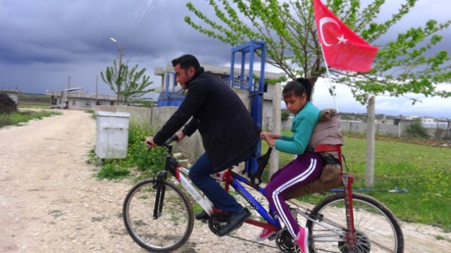 Şanlıurfa'da, engelli kızı Ayşe'nin bisiklete binme hayalini gerçekleştirmek isteyen Fevzi Beyunca, kızı için 2 bisikleti birleştirerek 2 kişilik bisiklet yaptı.