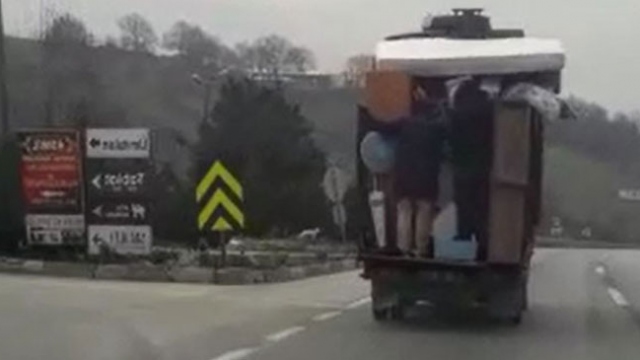 Bursa-Ankara yolunda 2 kişinin ev eşyası yüklü kamyonetin arkasında yaptığı yolculuk, trafikte korku dolu anlara sebep oldu.