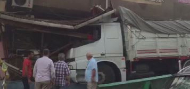Freni boşalan kamyon, iş yerine çarparak durabildi