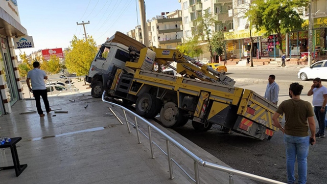 Gaziantep'te freni boşalan vinç, bir iş yerinin iş yerinin merdivenlerine çarparak durdu. Kaza anı kameraya yansıdı.