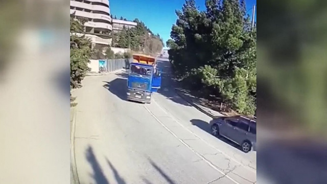 Kırım Özerk Cumhuriyeti'nde freni patlayan bir kamyon su parkına düştü. Kaza güvenlik kameraları tarafından görüntülendi.