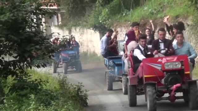 Gelin alayı otomobillerden değil, yörede sıkça kullanılan patpatlardan oluşuyor. Damat, patpatın direksiyonuna geçti, gelin ise römorkuna bindi.