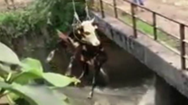 Giresun'daki sel nedeniyle dere yatağında mahsur kalan inek, iş makinesinin kepçesine bağlanan iple sudan çıkarıldı. İneğin kurtarılma anı kameraya yansıdı.