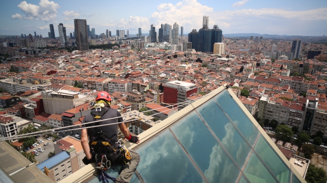 Yerden metrelerce yüksekliğe ulaşan gökdelenlerin bakım ve temizliği, dağcılık uzmanlığı gerektiriyor. Özellikle İstanbul’da gökdelenlerde çalışan endüstriyel dağcı sayısı hızla artıyor.