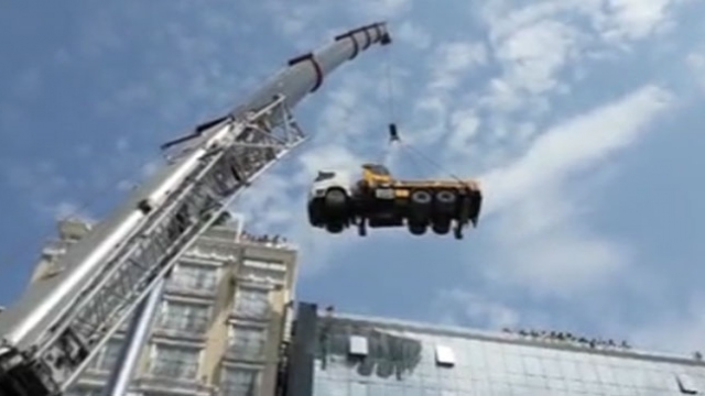 Taksim Meydanı'nda bir binanın çatısından indirilen mobil vinci görenler telefonlara sarıldı. O anları kaydedenler gökyüzünden kamyon iniyor yorumları yaptı.