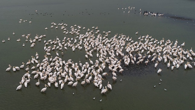 Güneye göç eden ak pelikanlar havadan görüntülendi