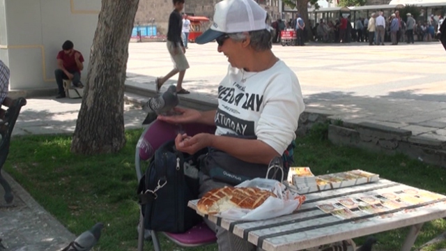 Kayseri'de Milli Piyango bileti satarak geçimini sağlayan Gülten Yaşar, kuşlara olan sevgisiyle etrafındaki yüzlerce güvercinin koruyucusu oldu.