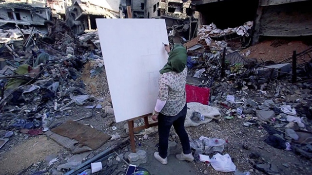 Suriye'de bulunan Yarmuk kampındaki harabelerle dolu bir alanda, 12 genç sanatçı tuvalleriyle şehri renklendiriyor.