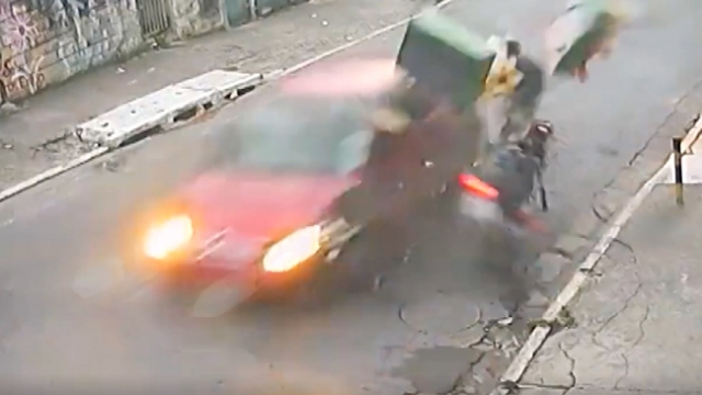 Brezilya'da yolu ortalayarak ilerleyen otomobil sürücüsü, karşı şeritten gelen motosiklete çarptı. Hava takla atarak yere düşen sürücü kazadan yara almadan kurtuldu.