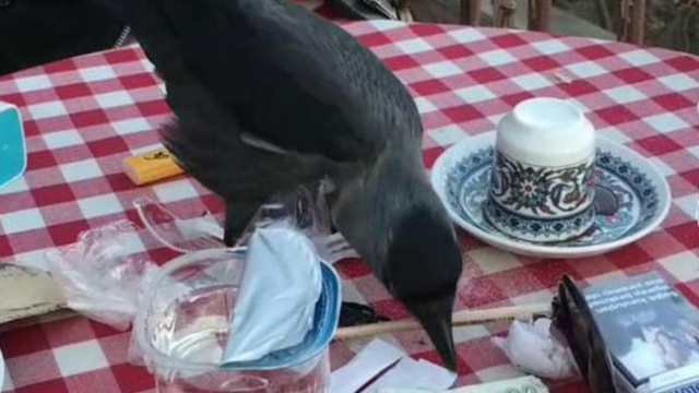 Tarihi Pierre Loti Tepesi'nde masalara dadanan karga maskot haline geldi.