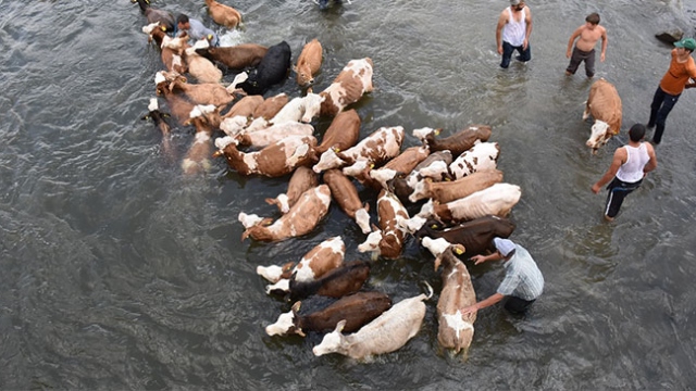 Kars'ta bazı besiciler, sıcaktan etkilenen büyükbaş hayvanlarını serinletmek için akarsuya götürdü.