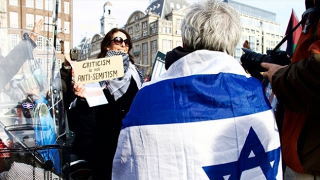 Hollanda'nın başkenti Amsterdam'da, İsrail bayrağı taşıyan bir Hollandalı, Balfour Deklarasyonu'nun 101. yılı nedeniyle düzenlenen protestoda göstericileri provoke etti.