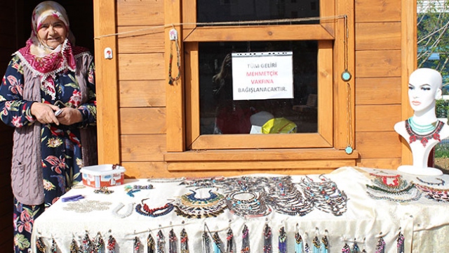 Boncuktan çeşit çeşit takılar yapan 73 yaşındaki Zerkalem Teyze, günlük yevmiyesinin tamamını Mehmetçik Vakfı’na bağışlıyor.