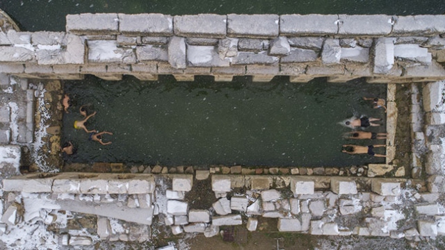 İki bin yıllık tarihi havuzda kar altında yüzüyorlar