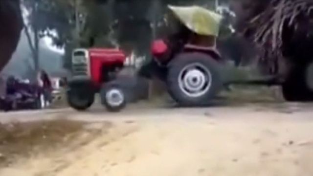 Hindistan'da römorkuna fazla yük alan bir traktör, hareket edemeyince başka bir araç tarafından halatla çekilmeye çalışıldı. Ancak buna dayanamayan traktör, gövdesinden ikiye ayrıldı.