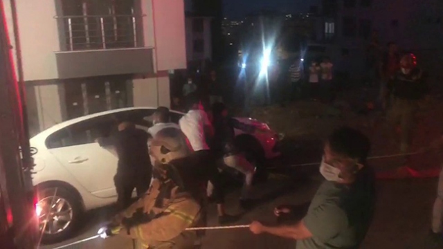 İstanbul'un Sultanbeyli ilçesinde bir inşaat çukuruna düşmek üzere olan otomobili mahalleli elleri ile tuttu. O anlar kameraya yansıdı.