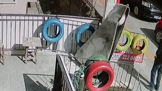 Çankırı'da bir çiçekçide arkadaşına yardım etmek için sipariş götüren kişinin başına 3. kattan halı düştü. Olay güvenlik kamerasına yansıdı.