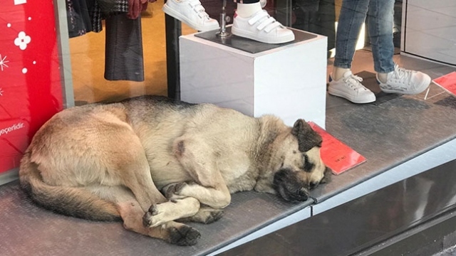 Ankara'da ısınmak ve uyumak için giyim mağazasının vitrinine giren köpek, çevredekilerin ilgi odağı oldu.
