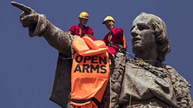 Akdeniz'de yaşanan göçmen dramına dikkat çekmek isteyen aktivistler, üzerinde "açık kollar" yazan turuncu bir can yeleğini Barcelona'daki Kristof Kolomb heykeline giydirdi.