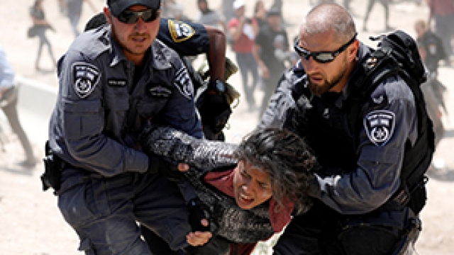 İsrail askerleri, Kudüs'ün doğusunda bulunan Han el-Ahmer'de bedevilere ait ev ve ağılların yıkılmasını protesto eden bir kadının başörtüsünü yırttıktan sonra yerde sürükledi.