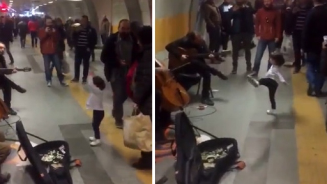 İstanbul'da bir metro istasyonunda sokak müzisyenlerini gören küçük bir kız çocuğu müzisyenlerin yanından bir an olsun ayrılmak istemedi.