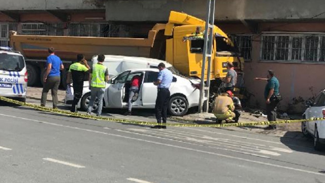 İstanbul'da ehliyetsiz sürücünün kontrolünü kaybettiği hafriyat kamyonu araçlara çarptıktan sonra yol kenarındaki bir iş yerine girdi. Kazada 1 kişi ağır yaralandı.
