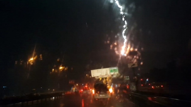 İstanbul’da dün etkili olan şiddetli yağış sırasında otoyolda bulunan bir elektrik direğine yıldırım düştü.
