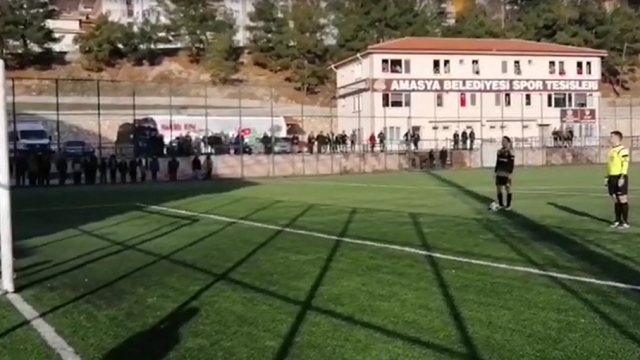 Amasya'da oynanan liseler arası futbol karşılaşmasında penaltı atışları yapılırken yakın bir bölgedeki okuldan İstiklal Marşı okunmaya başlayınca karşılaşmanın hakemi Ömer Karakaya maçı durdurup, futbolcularla birlikte saygı duruşuna geçti.