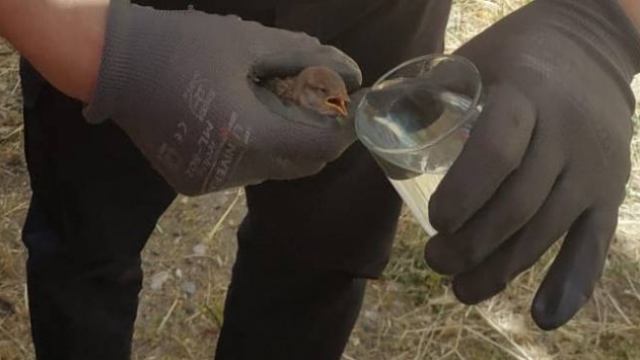 İtfaiyecilerin kurtardığı serçe "can suyu" ile yaşama tutundu