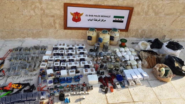 Jandarma ve MİT'in Suriye'nin kuzeyindeki Bab ilçe merkezinde DEAŞ terör örgütüne yönelik ortak operasyonunda 1 ton patlayıcı ele geçirildi.